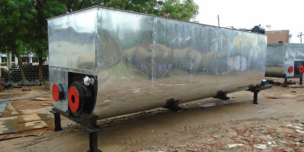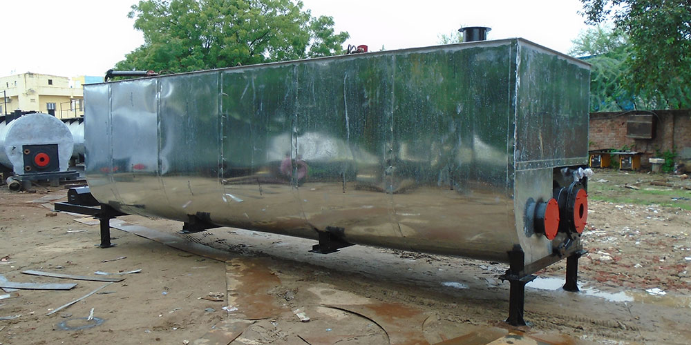 In In-direct heating type tanks-cylindrical in shape& horizontal in position, the bitumen is heated by circulating hot thermic oil through its heating coil. A thermic oil heater with oil fired burner heats the thermic oil & this hot-oil is circulated through the heating coil inside the bitumen tank by an oil pump on heater. A single heater can easily heat nos. of tanks as required in continuous process. The temperature of oil is very well controlled by an auto thermostat on heater and so, bitumen never gets over-heated. Thus, the quality of bitumen (viscosity) never get deteriorated/spoiled in this kind of indirect heating system. Fuel consumed to heat every ton of bitumen is also less compared that for a direct heating system.
