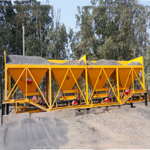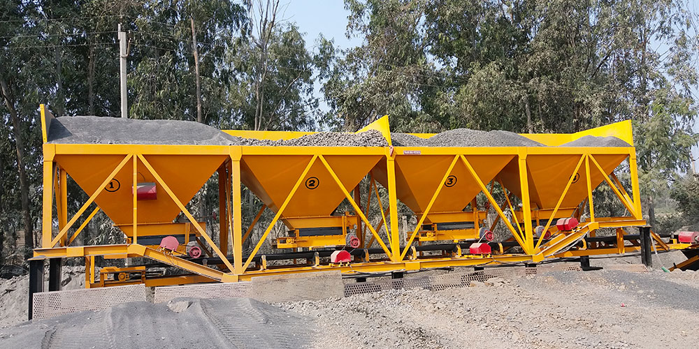 The Four Bin Feeder unit has four bins, each bin has a radial gate and a conveyor belt driven by individual AC motor drive so as to accurately control aggregate flow.