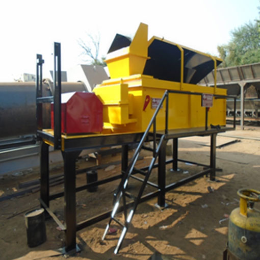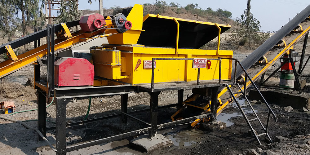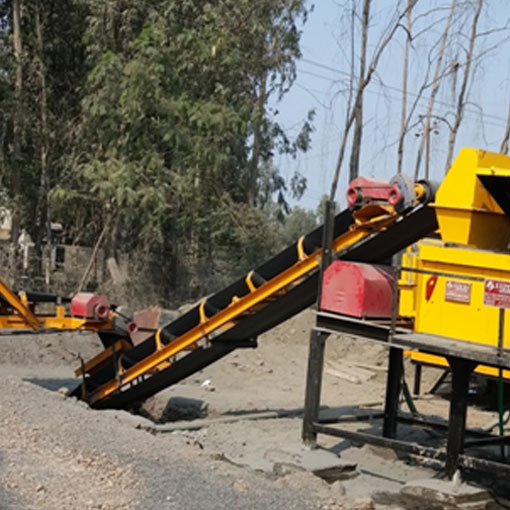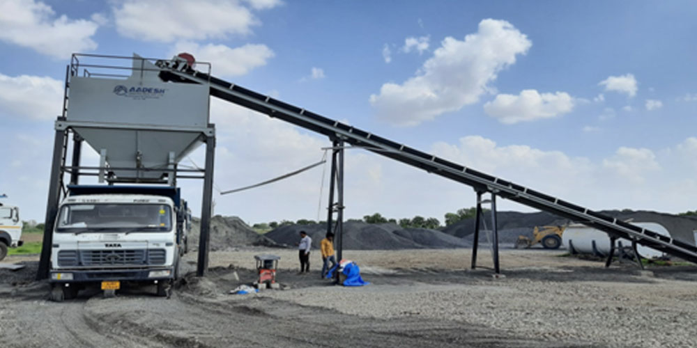 Slinger Conveyer conveying aggregate materials from four bin feeder to pug mill unit. Conveyor belt is M24 grade of MRF / Dunlop make.